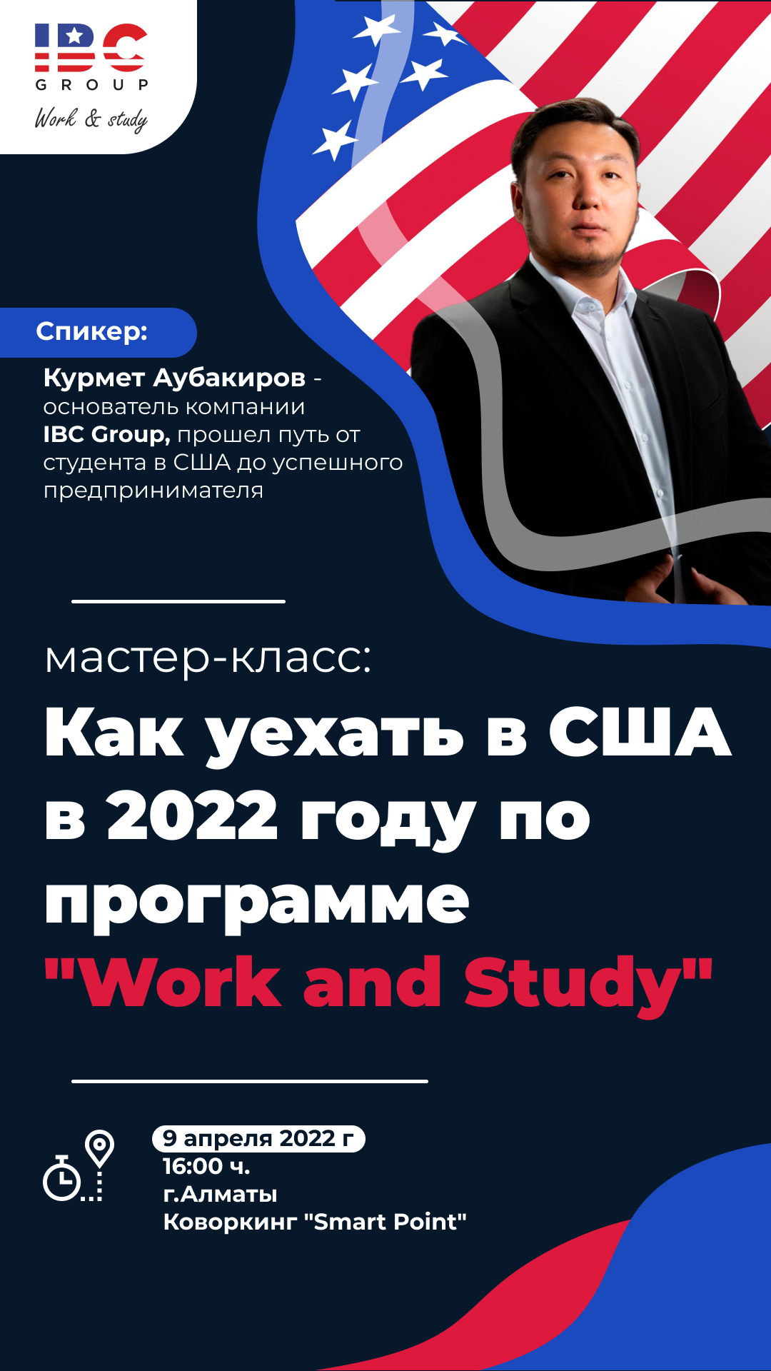 В городе Алматы пройдет мастер-класс на тему: "Как уехать в США в 2022 году по программе "Work and Study". Спикером выступит Курмет Аубакиров - основатель компании IBC Group, прошедший путь от студента в США до успешного предпринимателя. Он поделится своим опытом, расскажет и покажет подводные камни при поступлении, ответит на ваши вопросы.